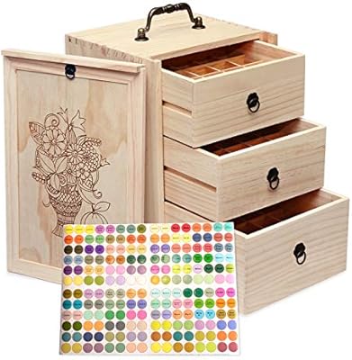 صندوق الزيت الأساسي صندوق تخزين خشبي مع مقبض يحمل 75 زجاجات وكرات الاسطوانة 3 المستوى الفضاء التوقف جميع الشمع الطبيعي النهاية منظم كبير أفضل لحفظ الزيوت الخاصة بك آمنة التسميات Eo