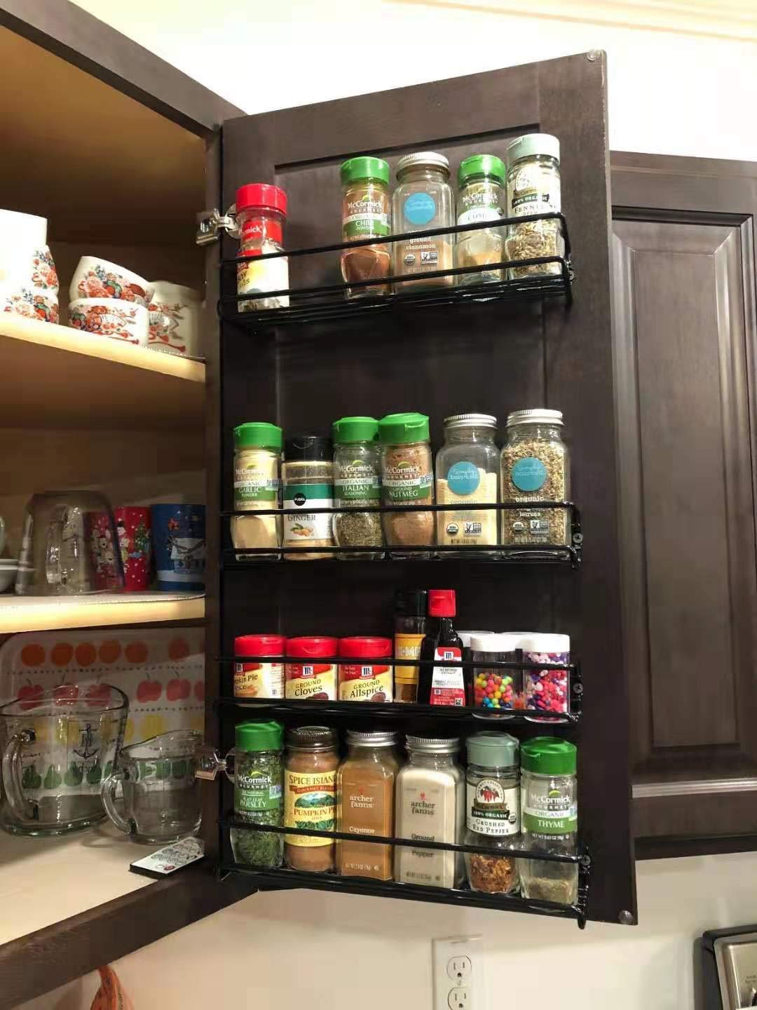 منظم منظم أغراض لأوعية التوابل للخزانة أو حامل الأبواب أو الحائط مجموعة من 4 رفوف سوداء للتعليق لبرطمانات التوابل للتخزين في الخزانة أو المطبخ أو المخزن عرض الزجاجات على