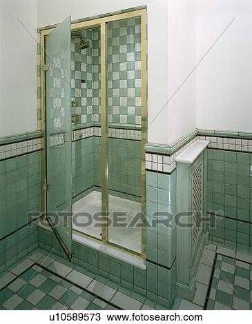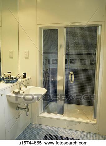 أبواب الزجاج عن إغتسل بالدش خزانة إلى داخل أزرق و أبيض حمام ألبوم الصور U10589573 Fotosearch